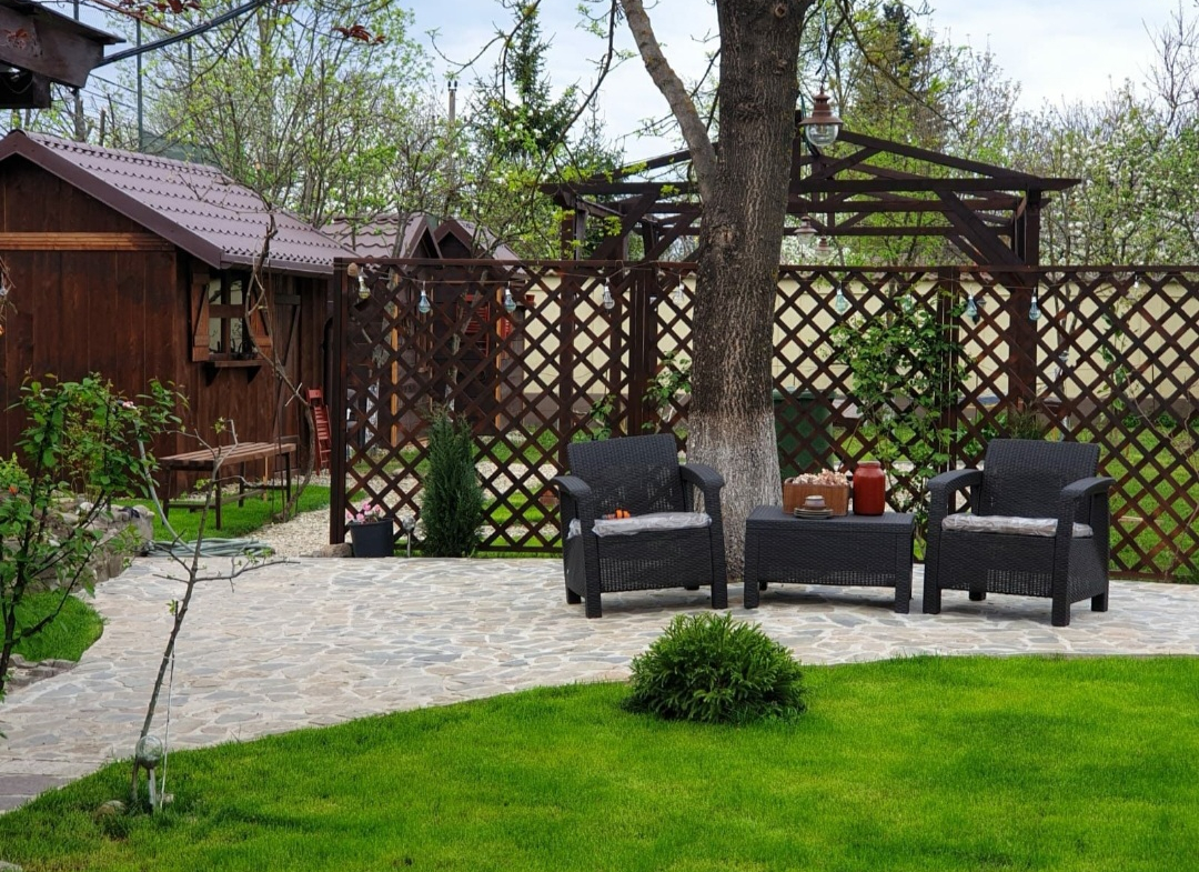 Se vinde o cabana stil rustic austriac, cu gradina complet amenajata, împărțită in doua zone delimitate de un gard decorativ.