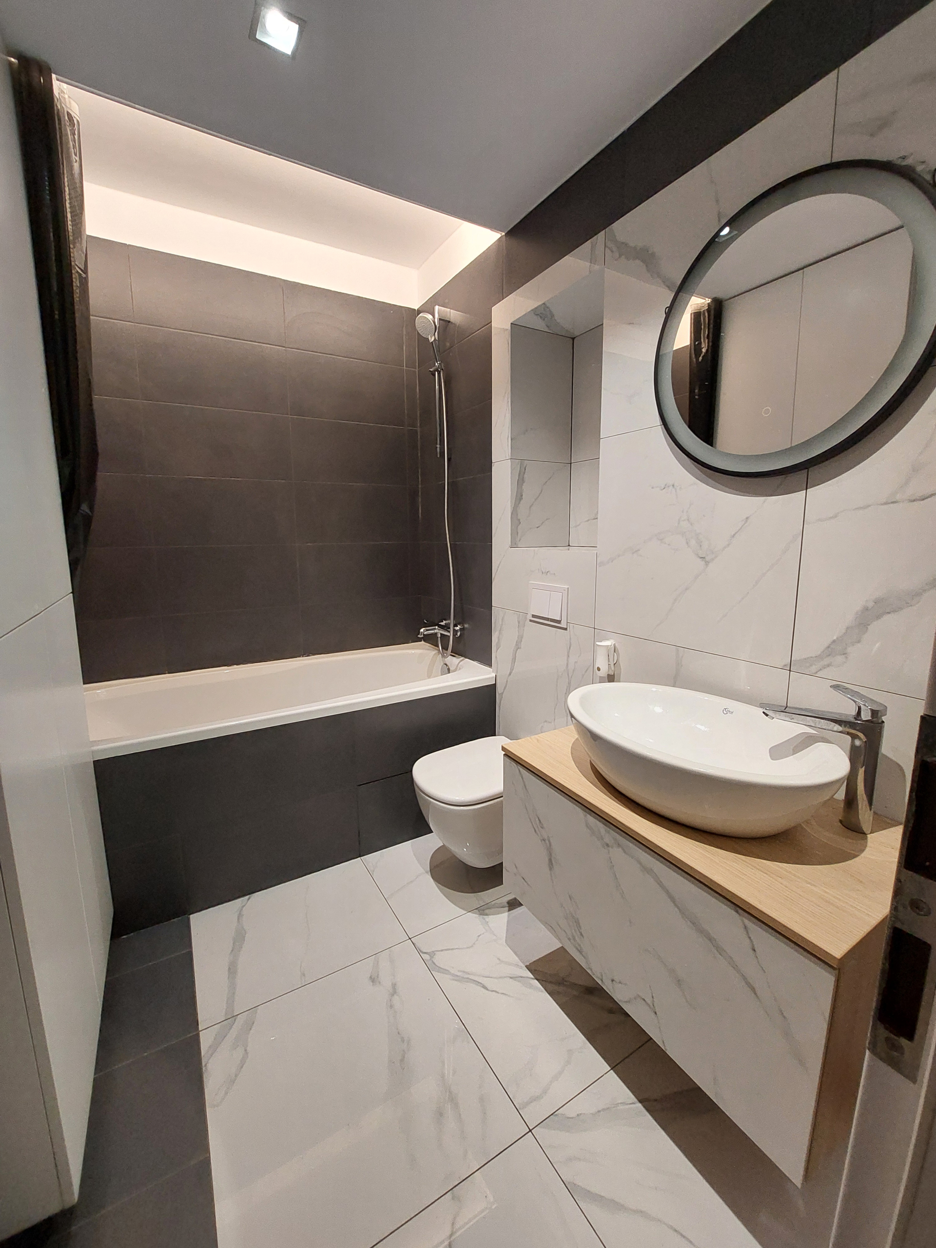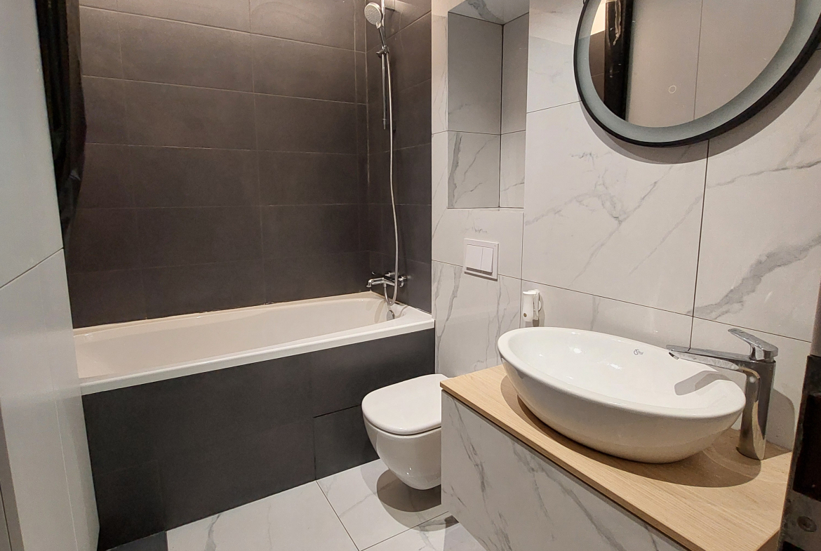Baia este moderna, personalizata, de calitate, cu dulap pentru depozitare diverse, oglinda luminata, banda LED, etc.
