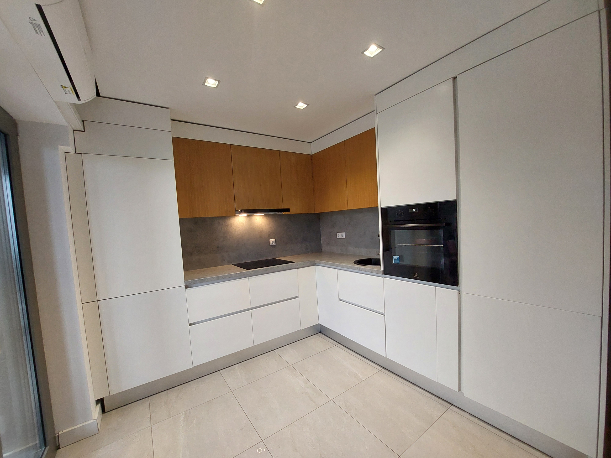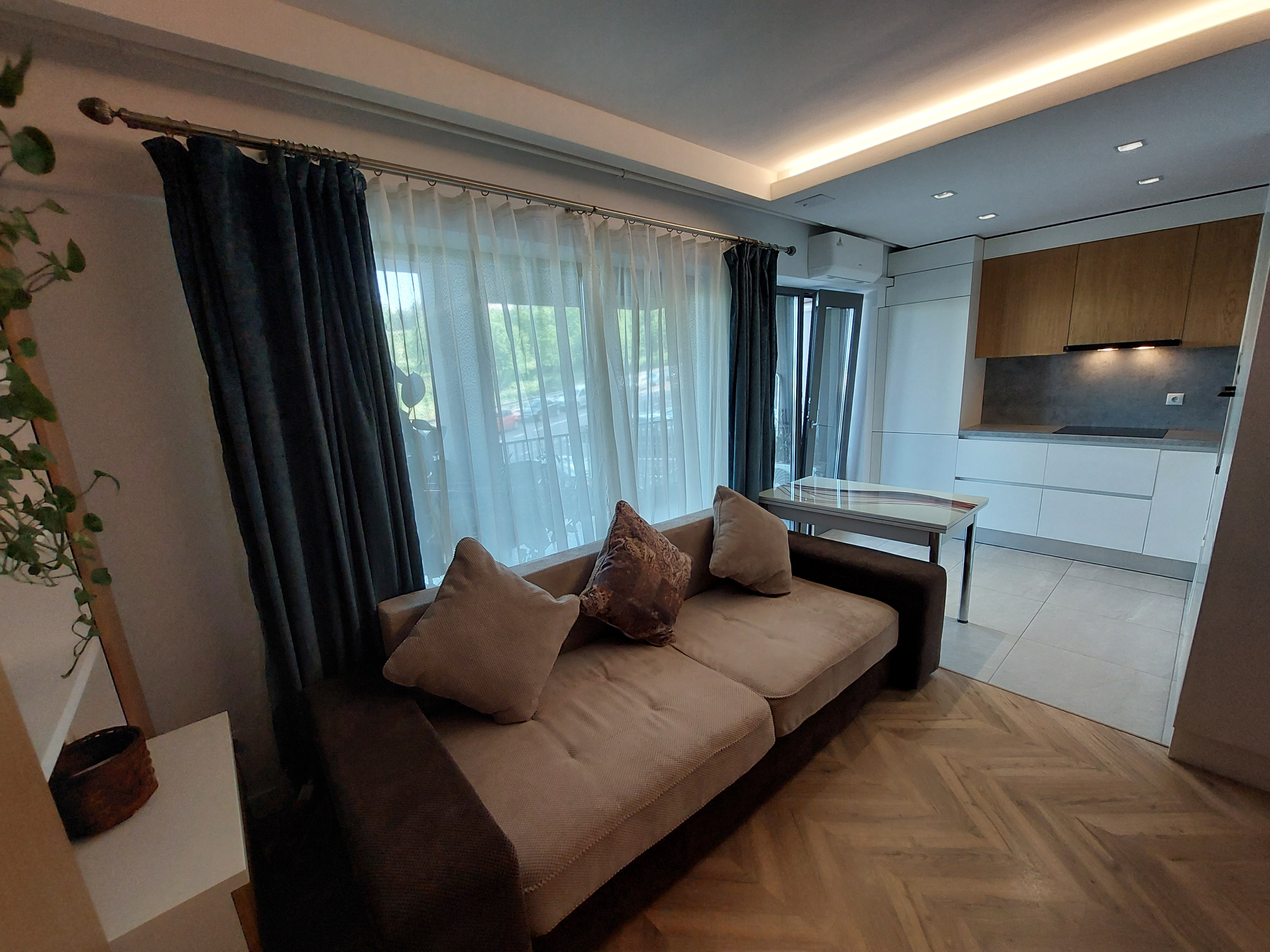 Iluminarea artificiala se face cu becuri LED economice. In apartament pe jos exista parchet in hol, dormitor,living. iar in baie si zona de bucatarie, gresie. Usa de la intrare este metalica, in interior sunt usi de culoare alba de la Porta Doors, iar tamplaria de aluminiu este de calitate.