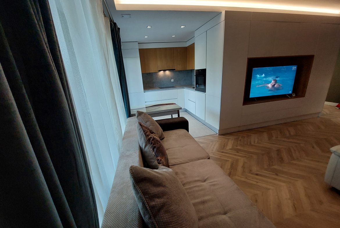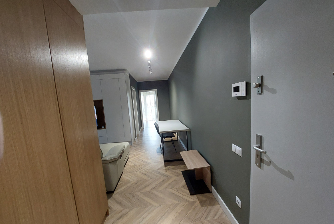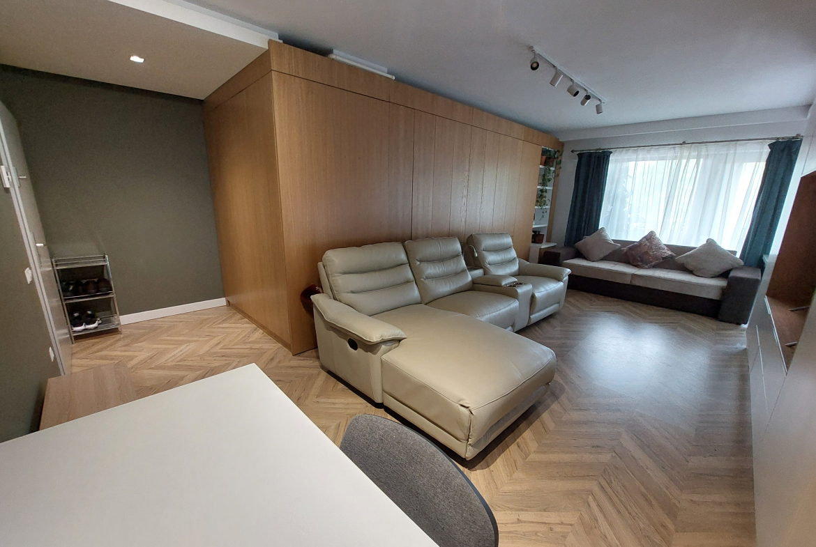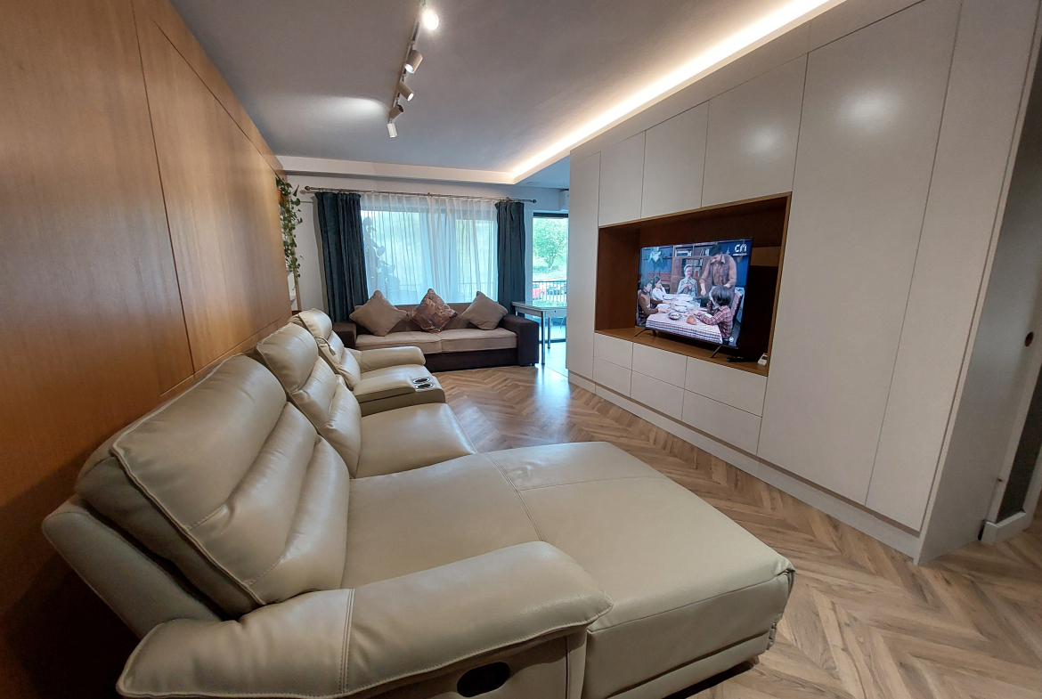 Amenajarea apartamentului a fost proiectata de architect designer, cu elemente de rigips si lumina LED. Mobilierul este din MDF si acopera o mare parte din pereti, facut conform proiectului.
