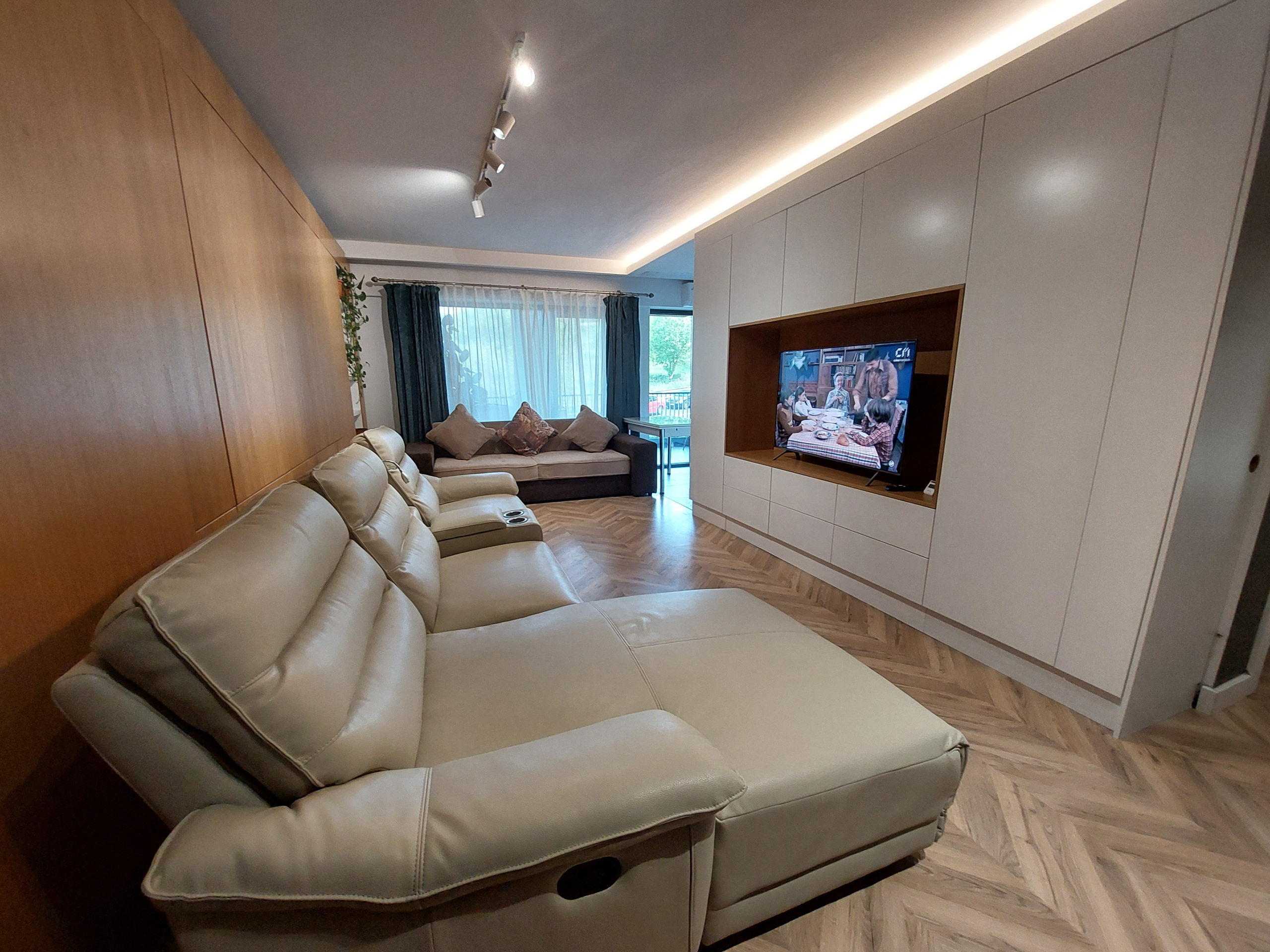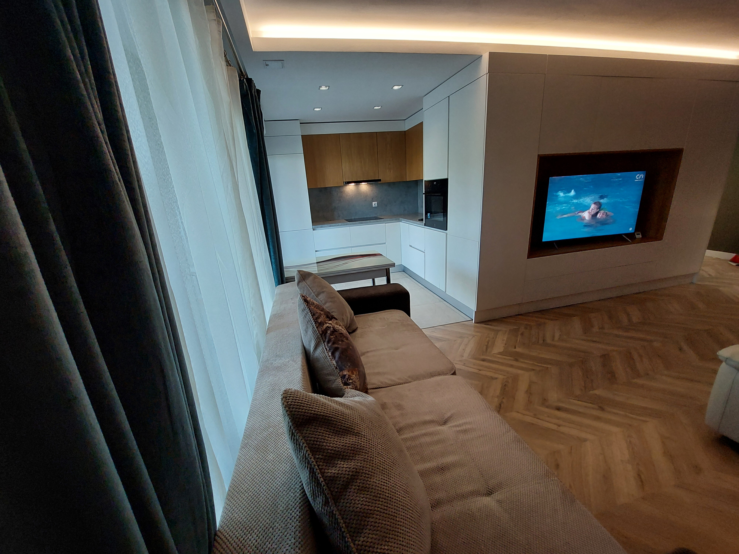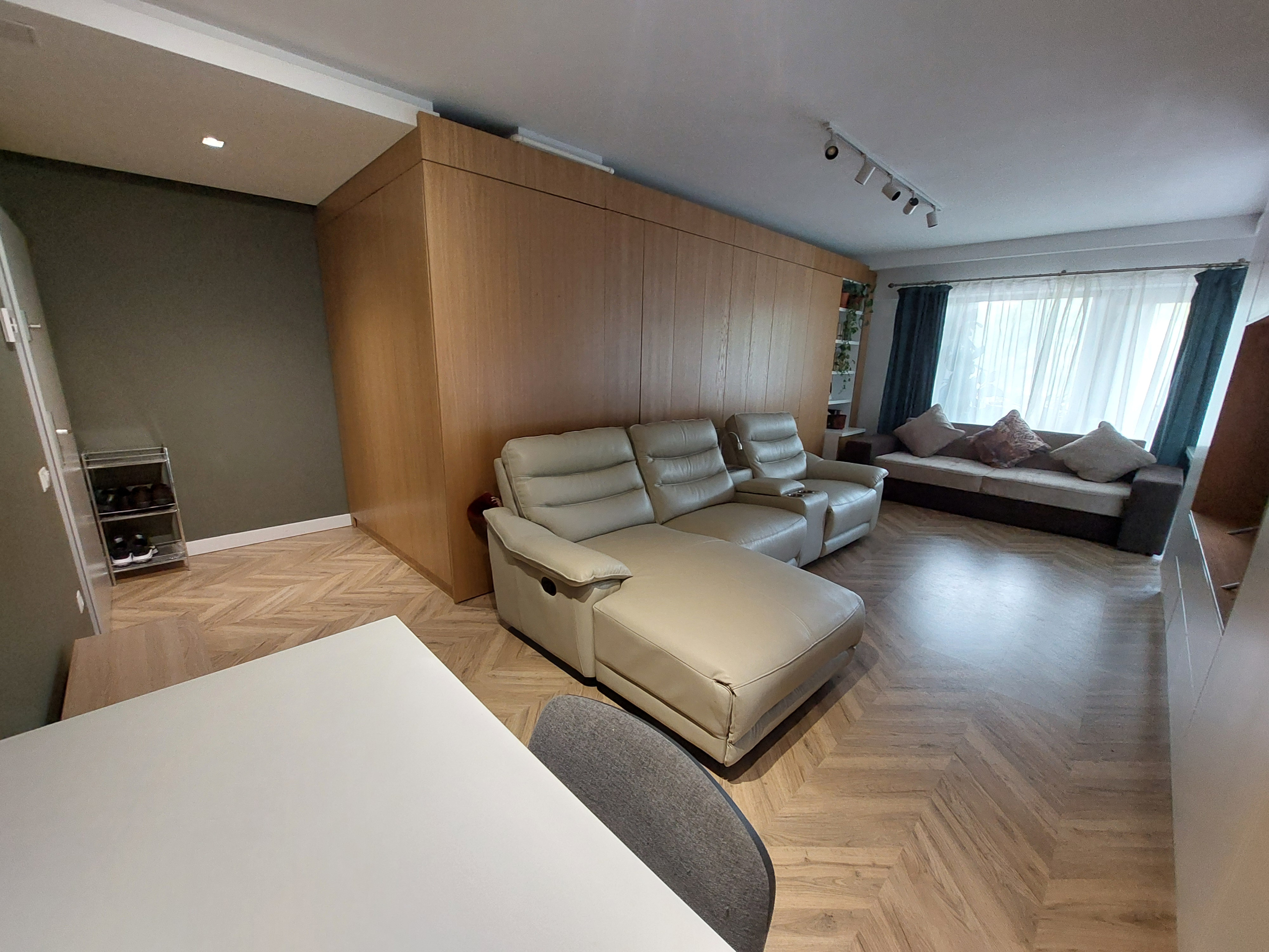 Amenajarea apartamentului a fost proiectata de architect designer, cu elemente de rigips si lumina LED. Mobilierul este din MDF si acopera o mare parte din pereti, facut conform proiectului.