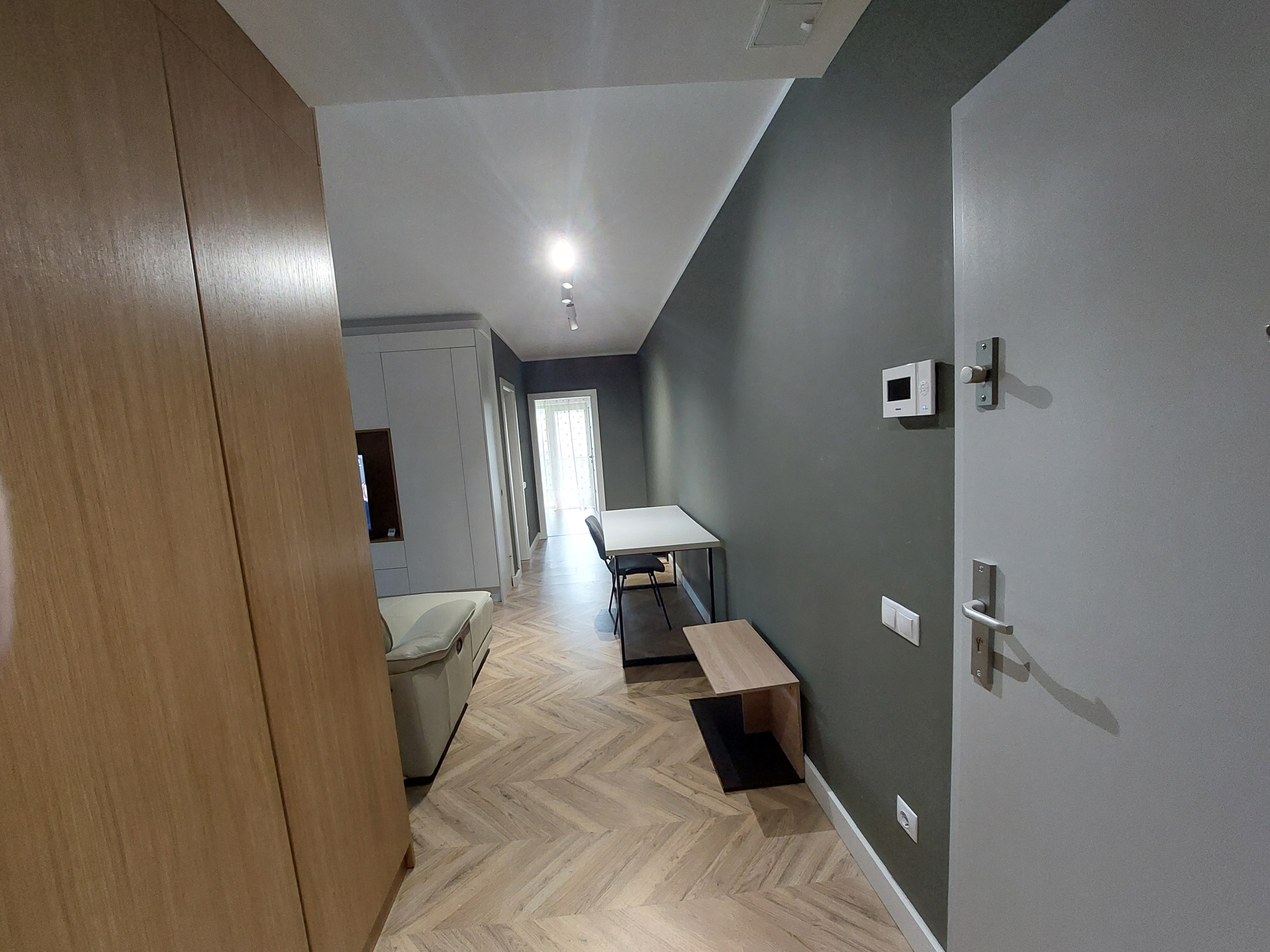Holul este lung si destul de lat, la intrare avem mobilier pe unul din pereti, si o masina de spalat incorporata.