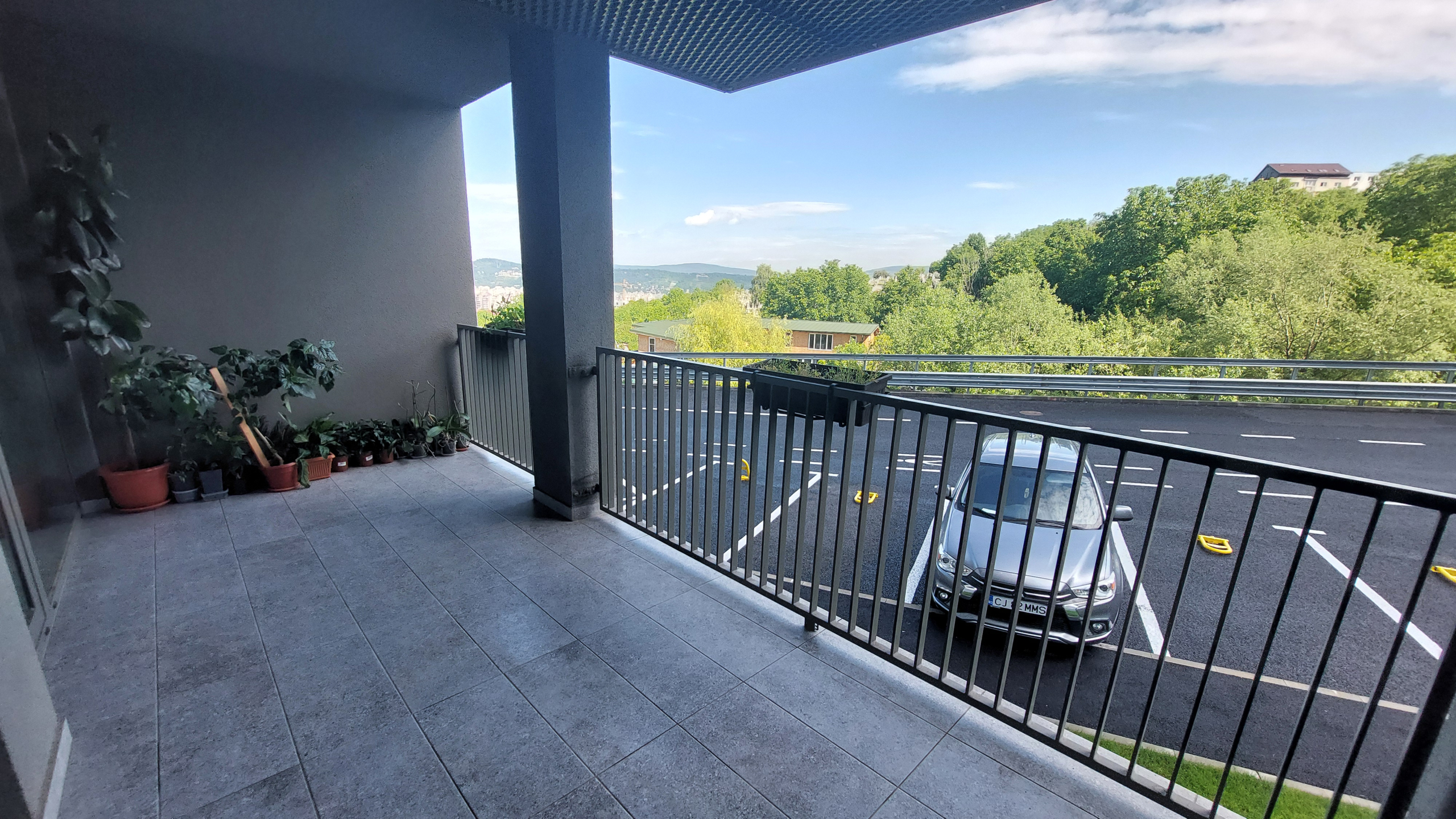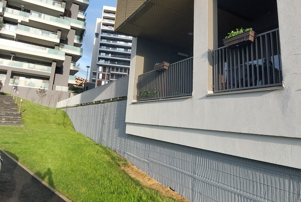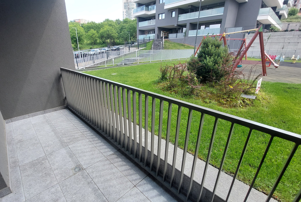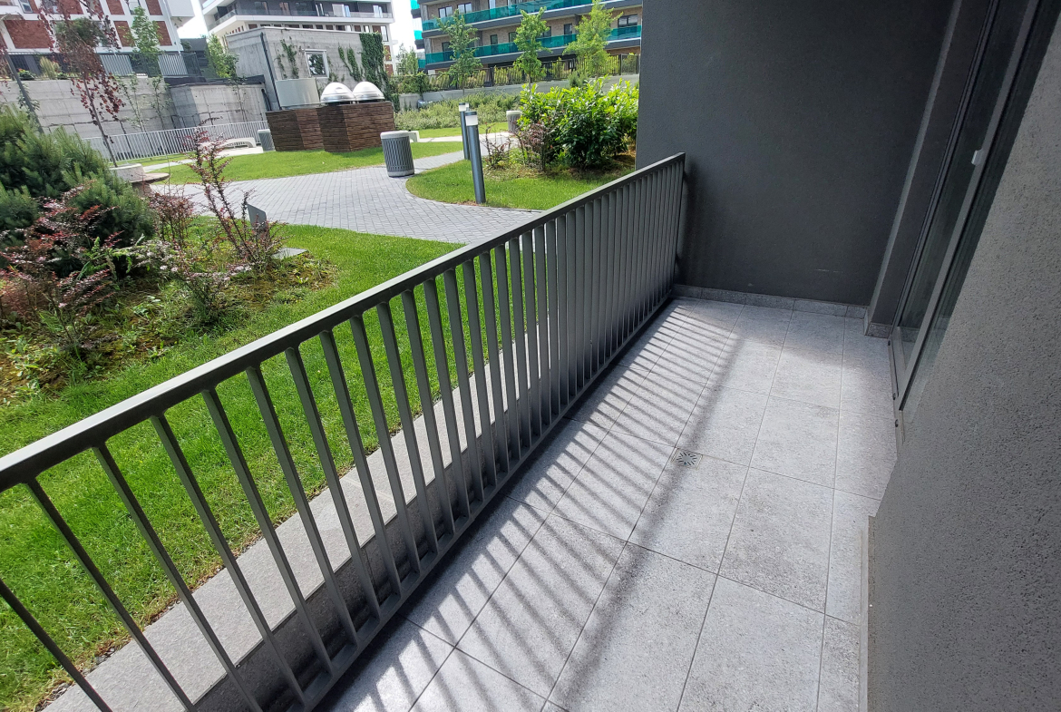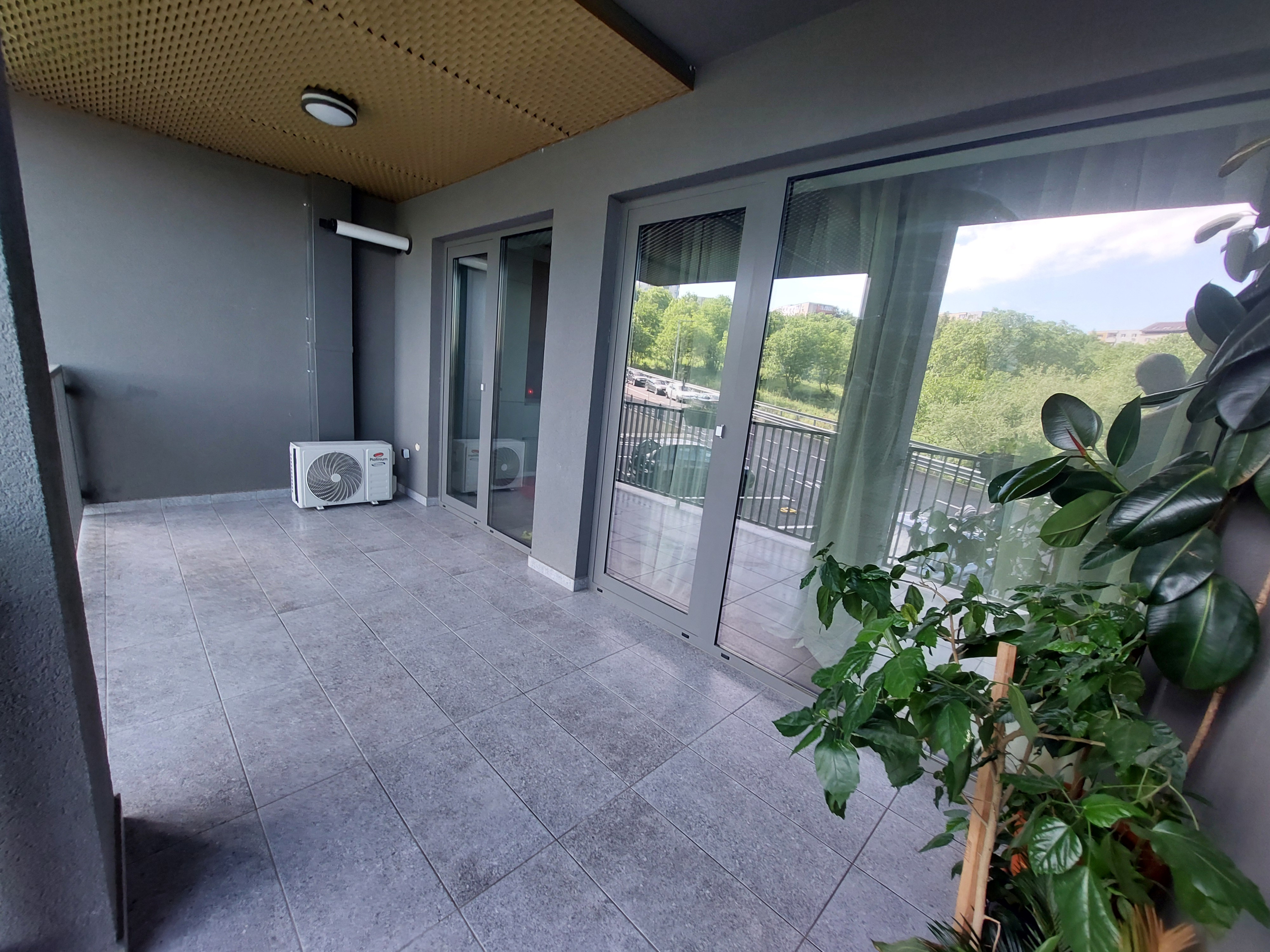 Apartamentul este situat in blocul Scala de pe str. Frunzisului la parter. 1 balcon, cel mai mare, de 11.73 mp, ce ii corespunde livingului si bucatariei, este situat la parterul inalt, iar cel de-al doilea de la dormitor, este cu vedere direct in zona verde-parculet.