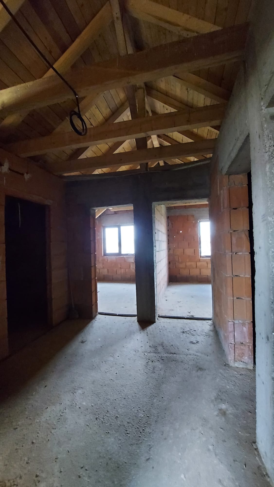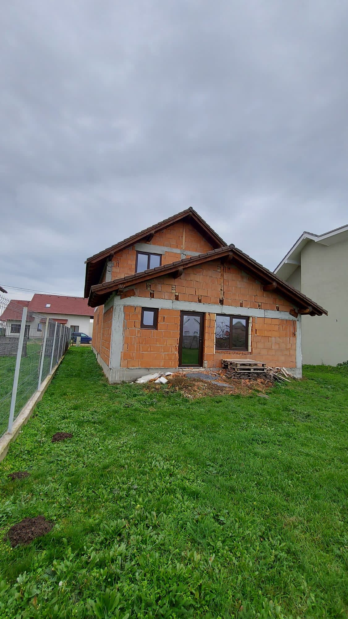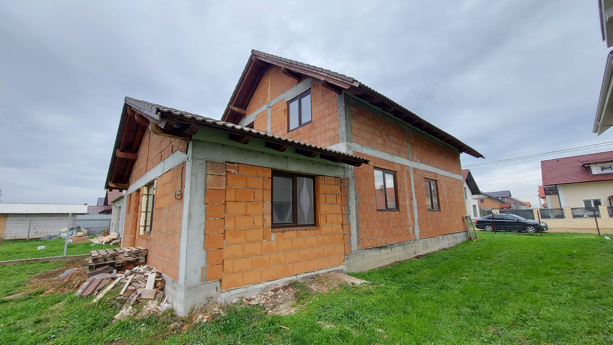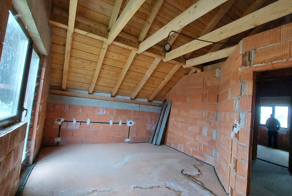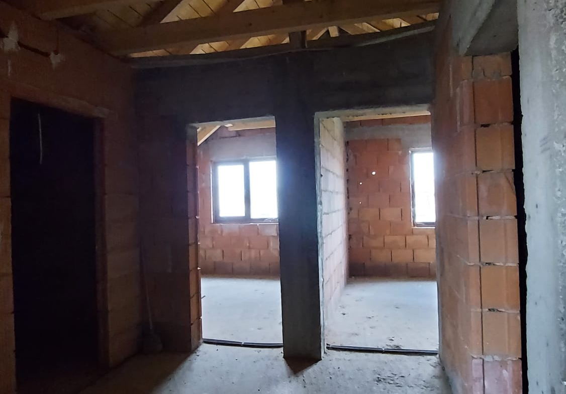 Vand casa P+M in loc Dudestii Noi. La doar 14km de Timisoara,casa fiind situata intr-un cartier rezidential. Supraf terenului este de 735mp. Front stradal de 15mp. Supraf desfasurata este de 194mp. Supraf construita este de 120mp.Casa este la rosu,are geamuri termopan,usi ext si instalatie electrica trifazic. Parter: living,dormitor,baie,bucatarie,camara si camera centralei. Mansarda: trei dormitoare,un dressing,baie .