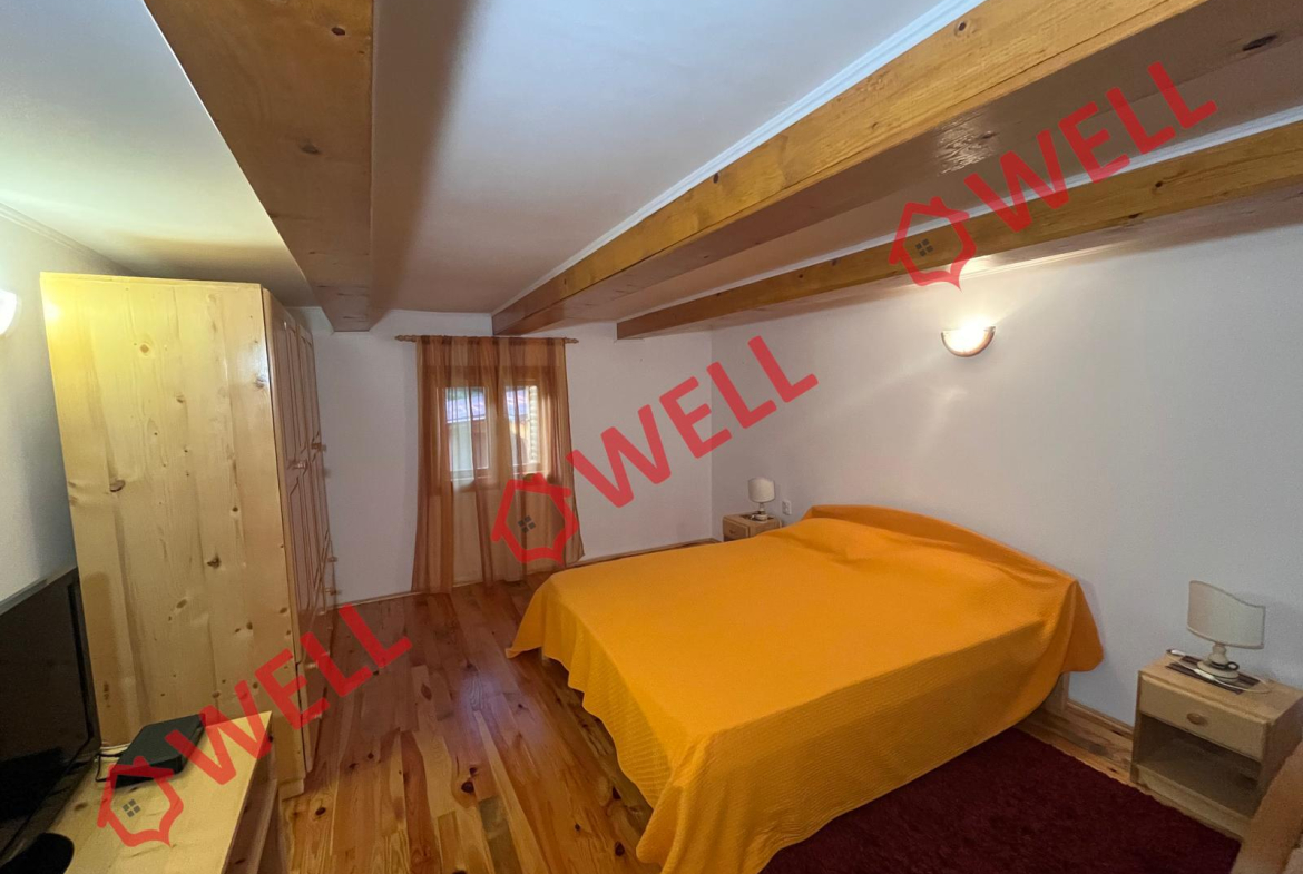 Casă de vânzare în Covasna, situată într-o zonă liniștită, lângă Spitalul de Cardiologie, la marginea pădurii – zonă turistică renumită pentru apele minerale și mofetele sale. Construită în 2010 din lemn, cărămidă și piatră, casa este pe un singur nivel, compusă din: living, bucătărie, baie, cameră tehnică, 2 dormitoare duble și 2 dormitoare single. Se vinde complet mobilată și utilată, cu tâmplărie și mobilier din lemn de brad. Încălzirea se face prin centrală pe lemne sau centrală electrică trifazică, casa fiind racordată la apă și canalizare publică, cu posibilitate de racordare la gaz. Curtea amenajată are arbuști ornamentali, magazie, garaj și spațiu de depozitare pentru lemne, precum și bazin de colectare a apelor pluviale. Proprietatea este împrejmuită cu gard din zidărie.