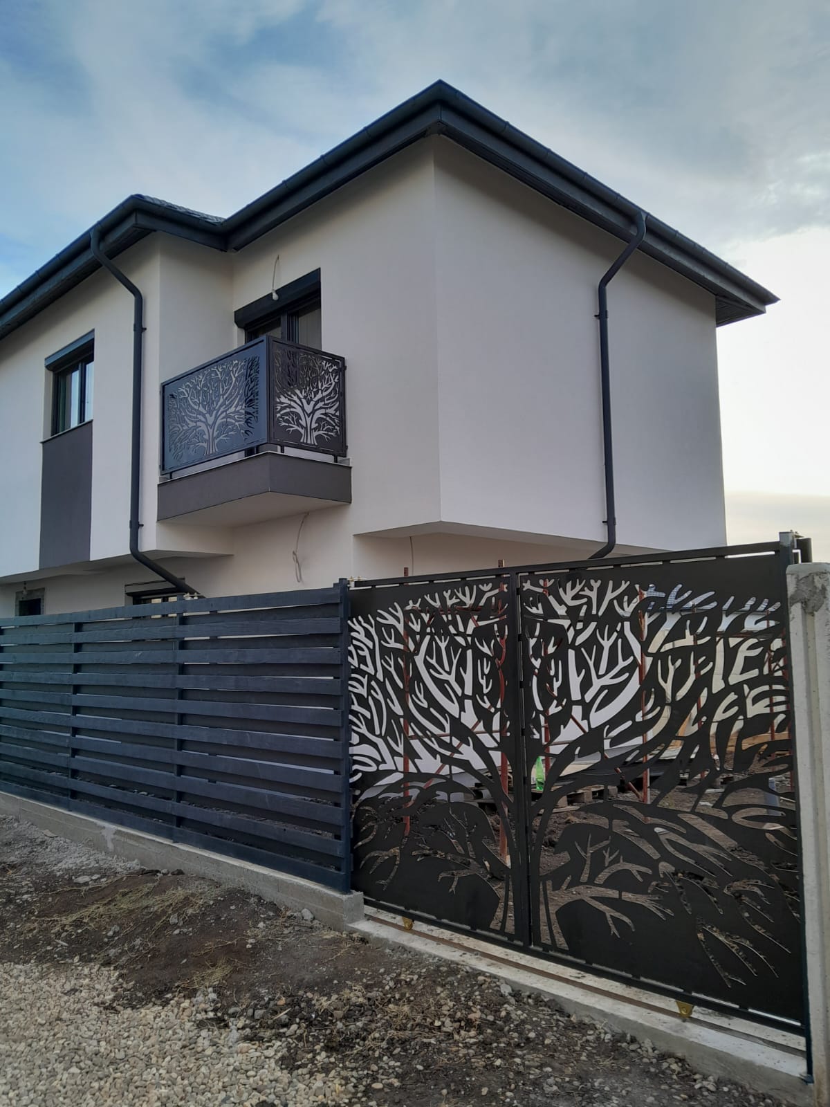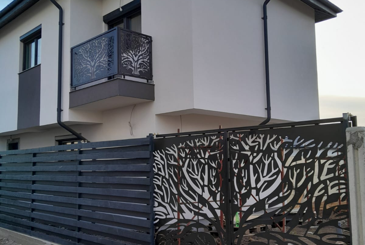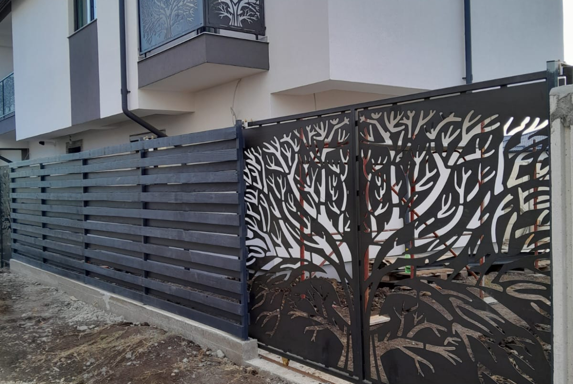 Curte amenajata cu pavaj, poarta auto, poarta pietonală și panourile decorative de la balcoane sunt model deosebit decupat cu laser, copacul vieții.