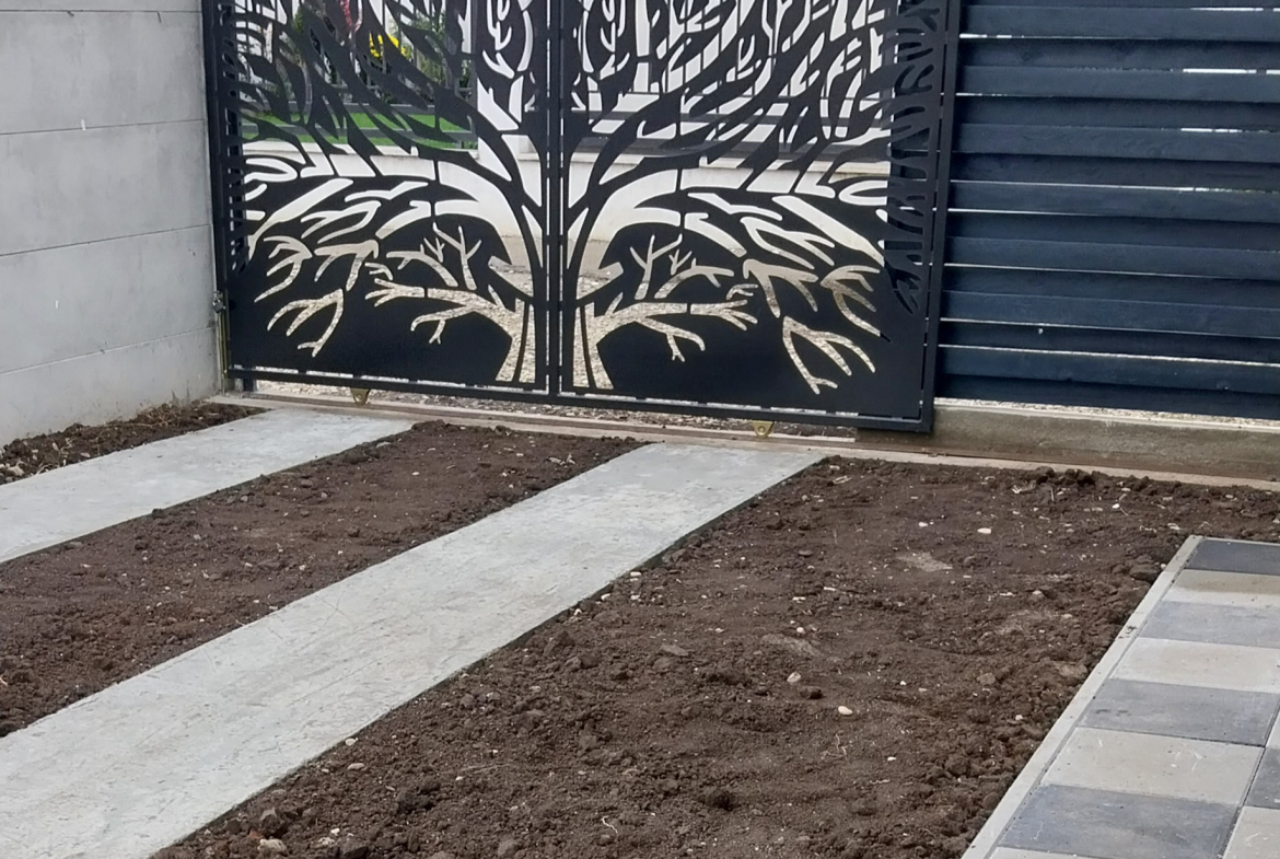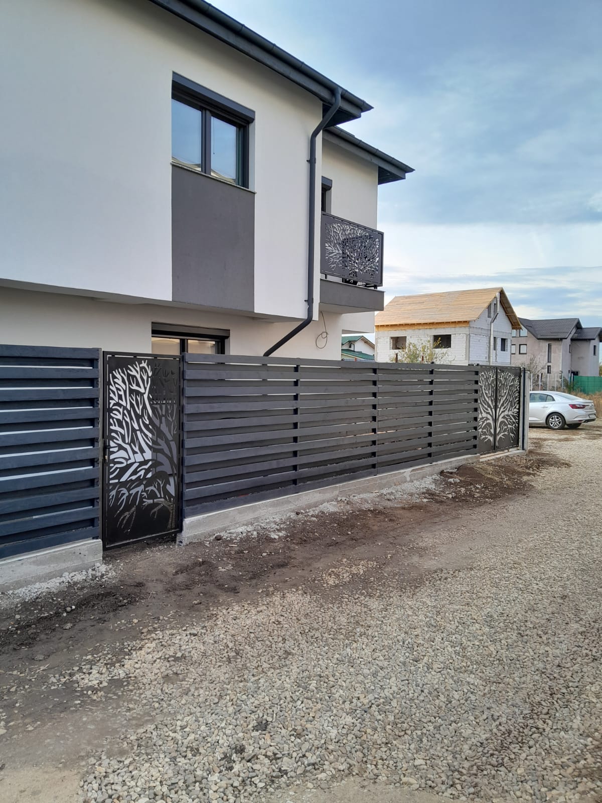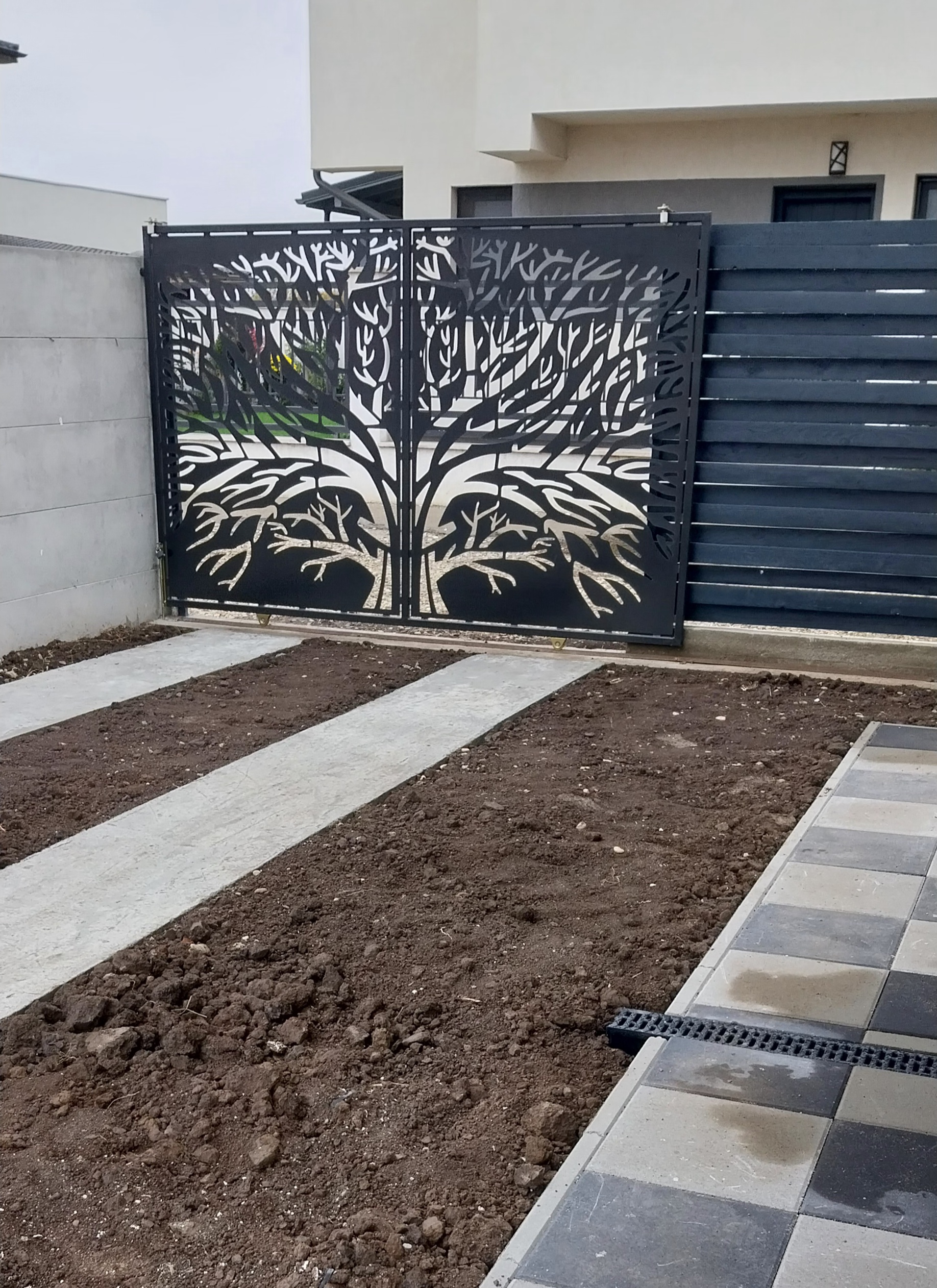 Curte amenajata cu pavaj, poarta auto, poarta pietonală și panourile decorative de la balcoane sunt model deosebit decupat cu laser, copacul vieții.