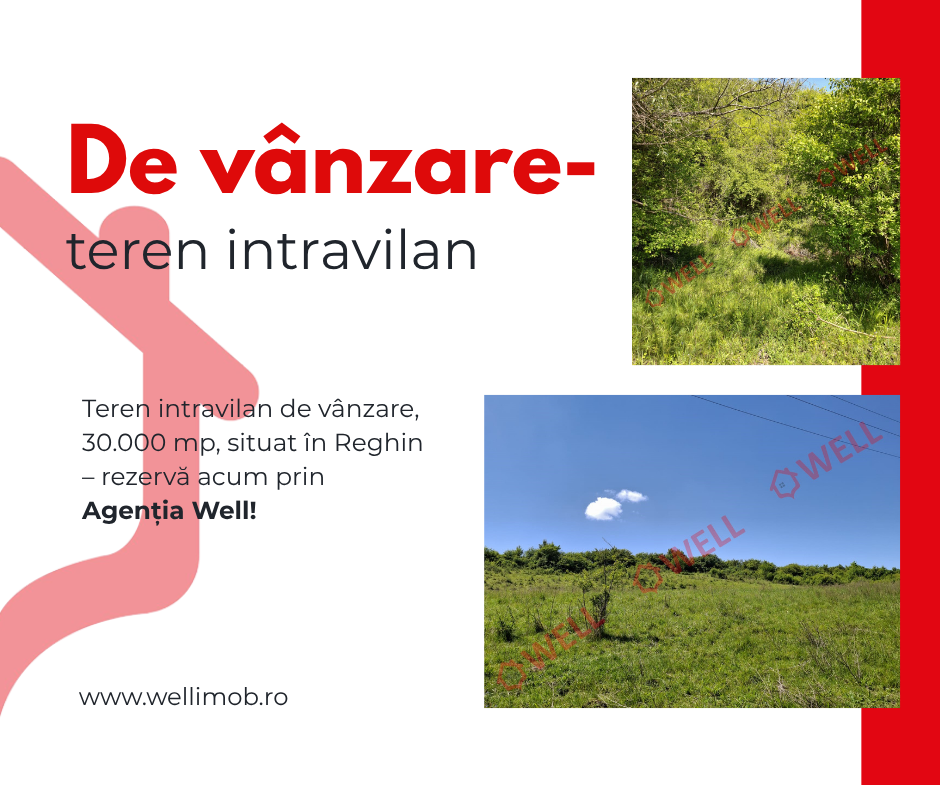 De vânzare teren intravilan de 30 000 m² (3 ha) în Reghin, la ieșirea spre Suseni, la aproximativ 100 de metri de drumul principal. Terenul este complet racordabil la utilități. Deschiderea este de aproximativ 40 de metri, lărgindu-se până la circa 65 de metri.