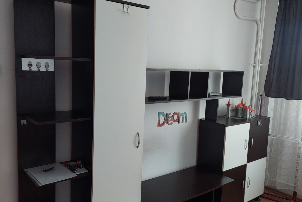 Mobilat: dulap haine, pat matrimonial, noptiere, canapea extensibila, bibliotecă, mobilier bucătărie.