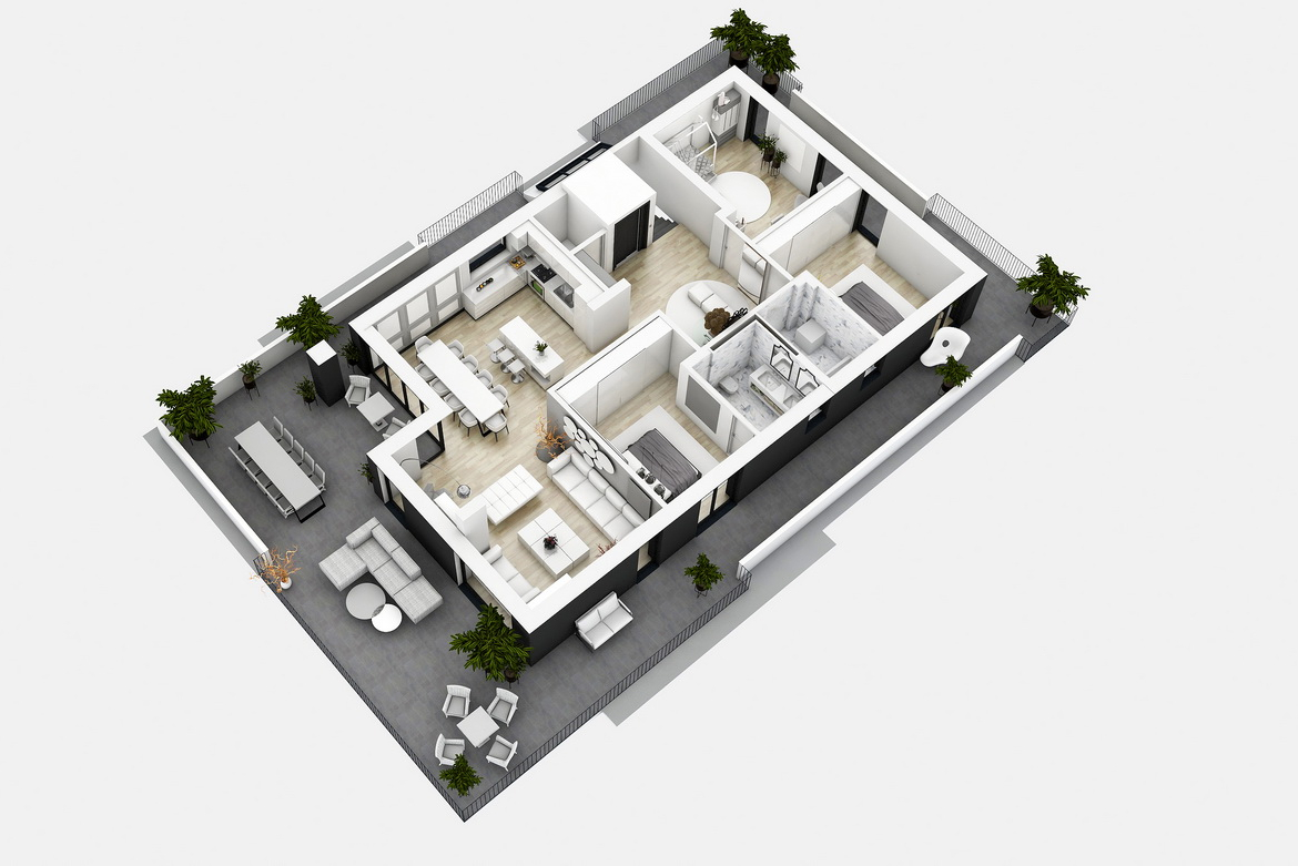 • Terasa circulabila are placa de beton, strat bariera si difuzie vapori, termo-izolatie – polistiren expandat de inalta densitate de 20 cm grosime, sapa de panta armata cu fibra polipropilena, geotextil, hidroizolatie- membrana PVC, deck din lemn termotratat pentru exterior;