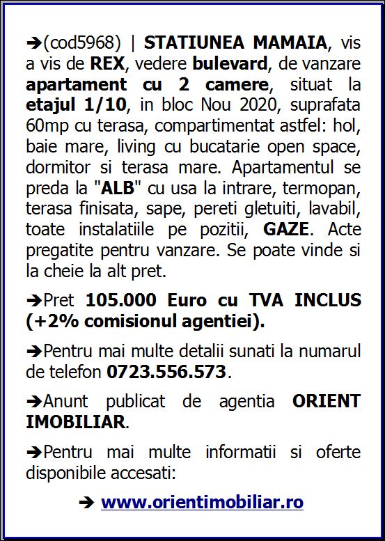 (cod5968) | STATIUNEA MAMAIA, vis a vis de REX, vedere bulevard, de vanzare apartament cu 2 camere, situat la etajul 1/10, in bloc Nou 2020, suprafata 60mp cu terasa, compartimentat astfel: hol, baie mare, living cu bucatarie open space, dormitor si terasa mare. Apartamentul se preda la “ALB” cu usa la intrare, termopan, terasa finisata, sape, pereti gletuiti, lavabil, toate instalatiile pe pozitii, GAZE. Acte pregatite pentru vanzare. Se poate vinde si la cheie la alt pret.