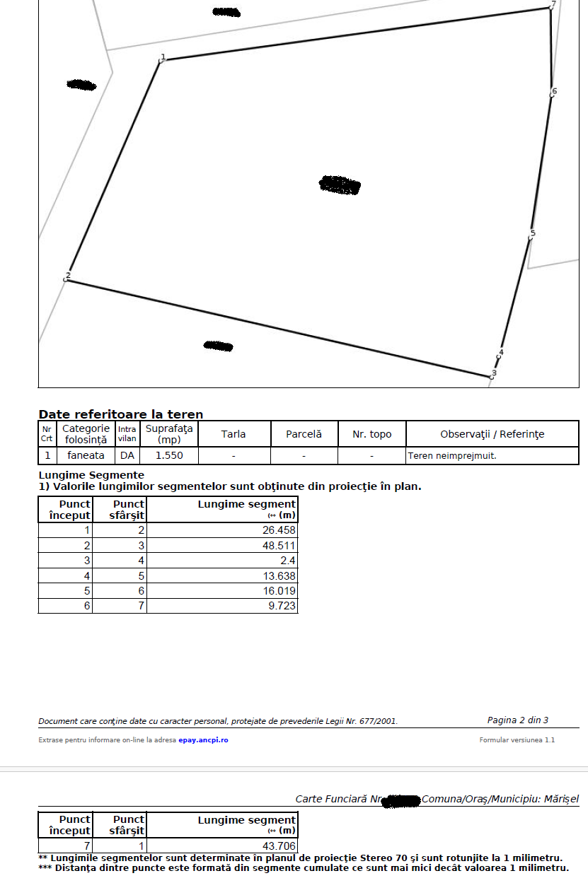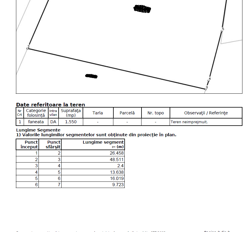 Terenul este intravilan, iar categoria de folosință este fâneață în suprafață de 1550 mp, având front la drum de 26,50 ml.