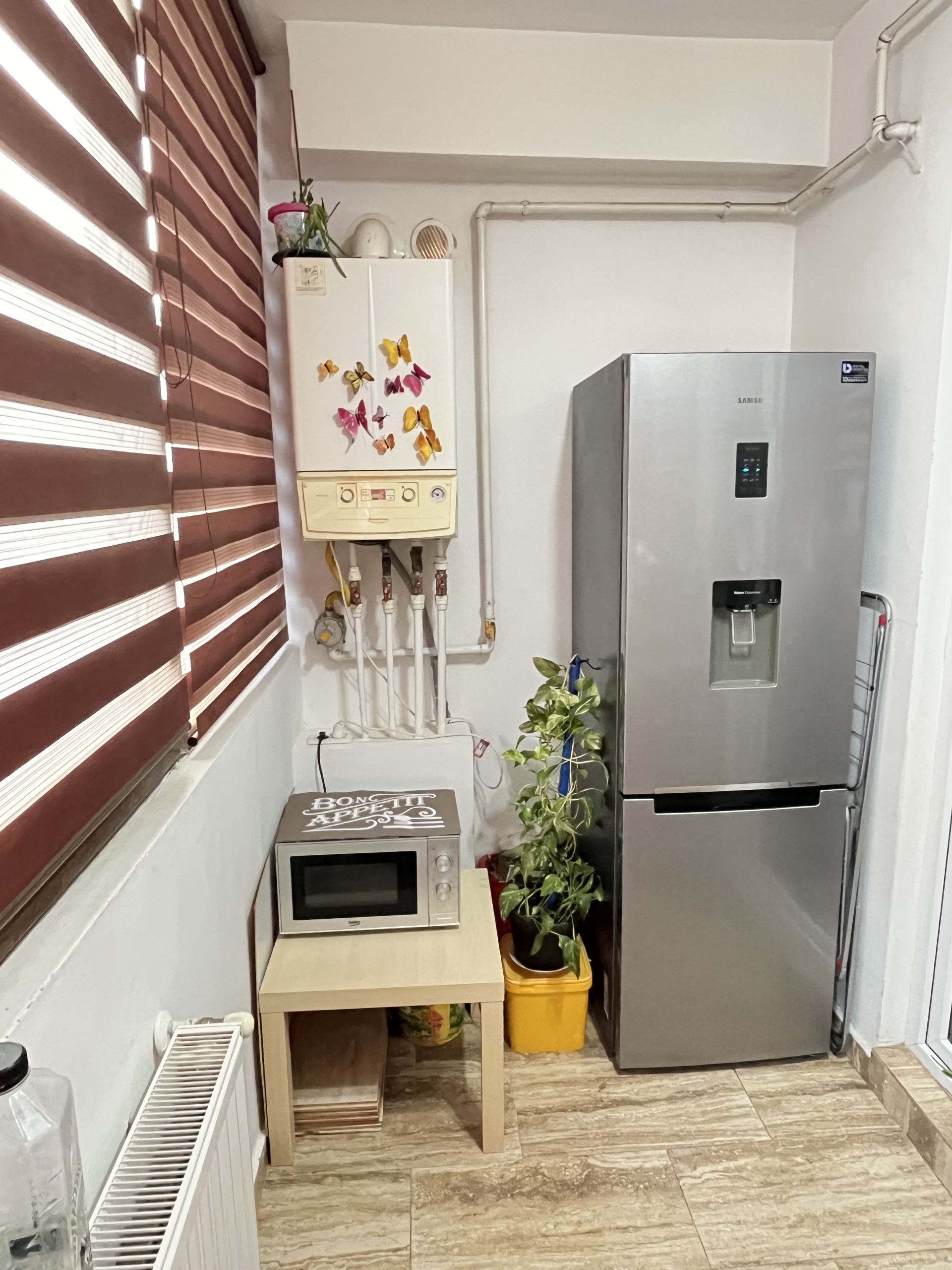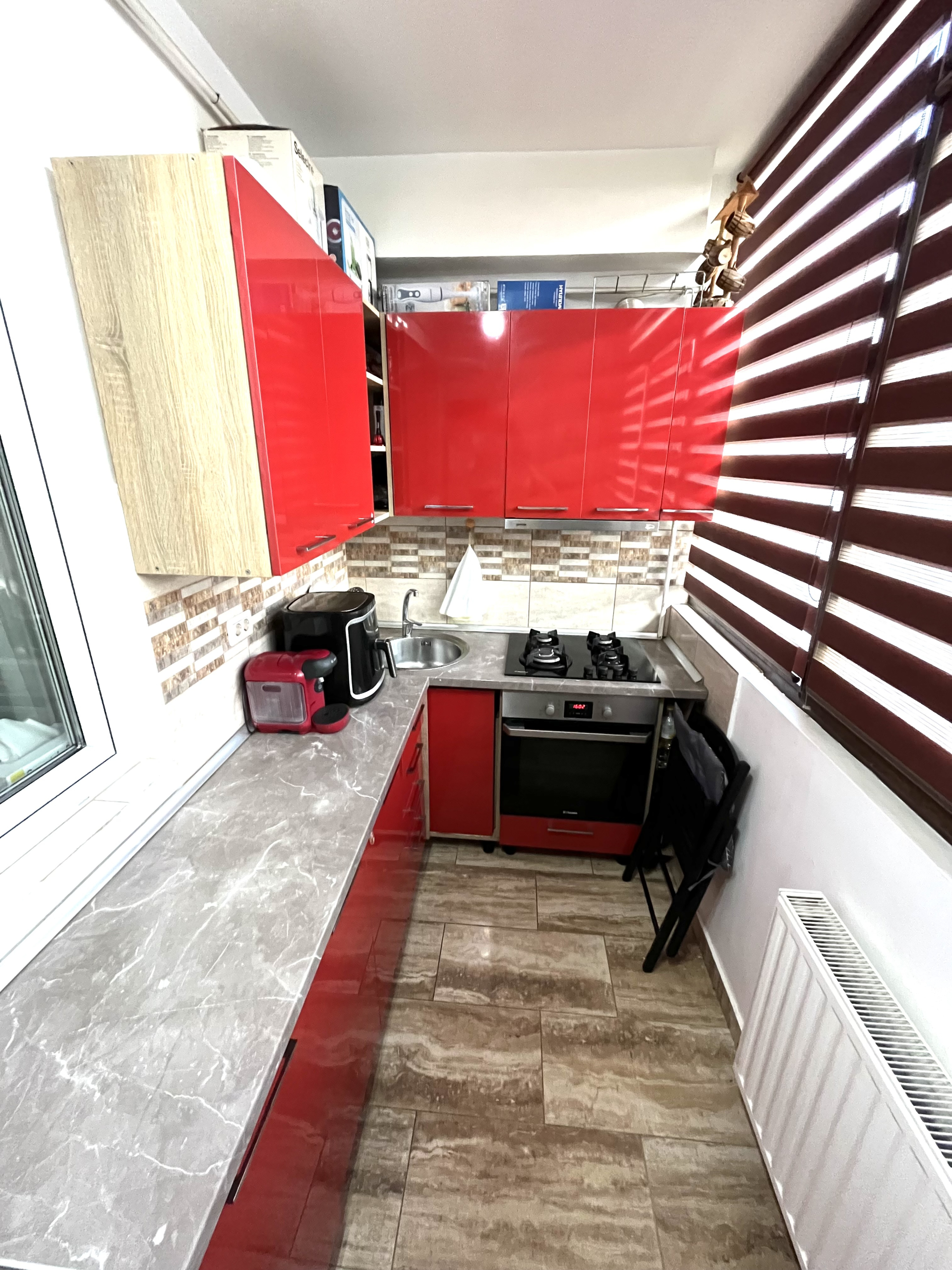 Bucătăria se află pe balcon care are o dimensiune de 6mp .